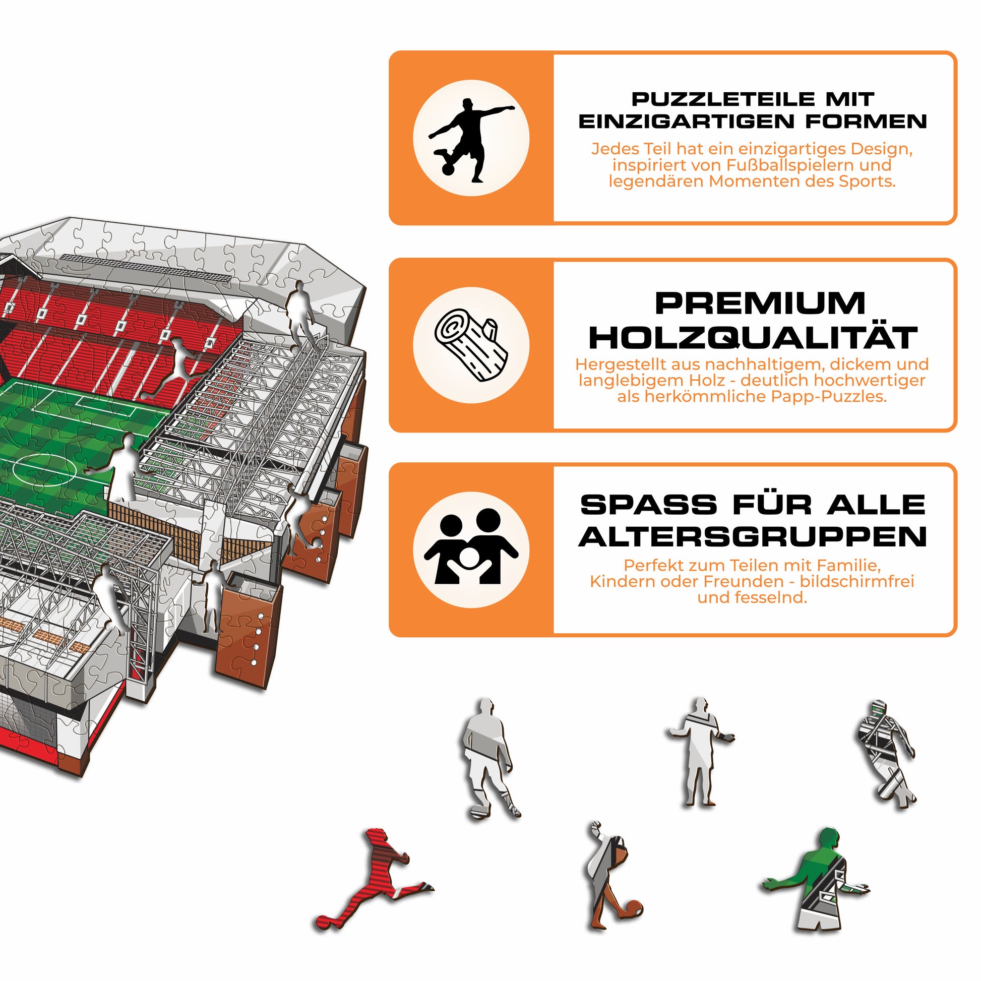 Jedes Puzzleteil hat eine einzigartige Form, die Elemente aus dem Fußball und ikonische Spielerposen darstellt.