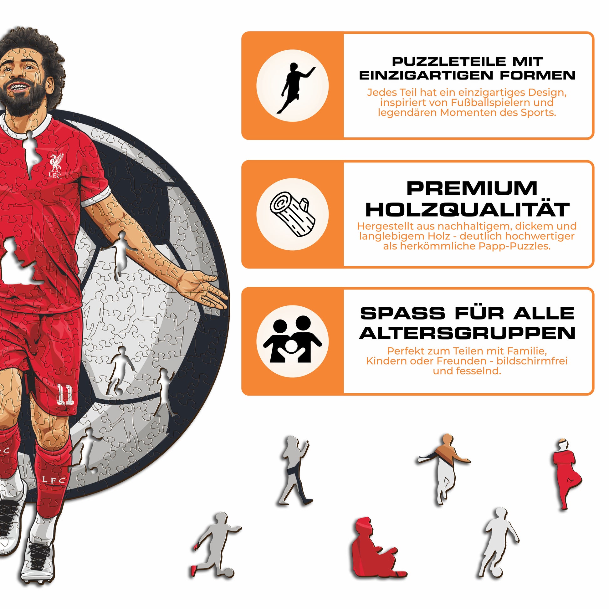 ✓ Jedes Puzzleteil hat eine einzigartige Form, die Elemente aus dem Fußball und ikonische Spielerposen darstellt.